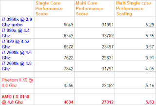 Comparing my AMD FX 8150 @ 4.8 Ghz to an intel 2600k @ 4.6 Ghz for 10 of the 12 tests, and a 2600k @ 4.3 Ghz for 2 of the 12 tests, we see an average performance difference of -0.07% , implying that AMD is still not so behind in this notoriously Intel favoured benchmark. The reason that two of the tests were not carried out @ 4.6 Ghz in the .NET Arithmetic scores , but instead @ 4.3 Ghz , is because scores @ 4.6 Ghz were not included in the internal comparison benchmarks listed. Of course this will play into the averaged difference, so I suspect that the 2600k @ 4.8 Ghz should beat the FX 8150 @ 4.8 Ghz by an average of 5% give or take. I might re visit this later on with my own testing to confirm this.
